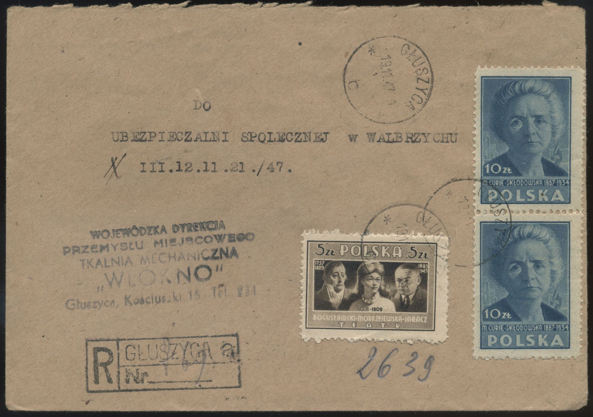 1947 list polecony z Głuszyca do Wałbrzycha, na odwrocie stempel odbiorczy. | Fi.432B, 434B |