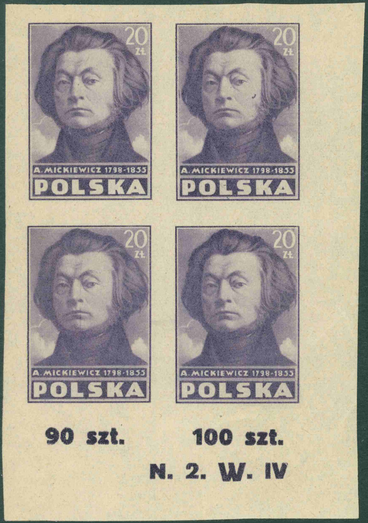 1947 kultura polska, prawy czworoblok prób - znaczków nie wprowadzonych do obiegu, w barwie szarawofioletowej o charakterystycznym ostrym kontrastowym rysunku, na dolnym marginesie oznaczenie walca N.2.W.IV, na prawym górnym znaczki ciekawa usterka - "szrama" na lewym policzku, gwarancja i opis Schmutz. | Fi.436AP4 Mi.470B |