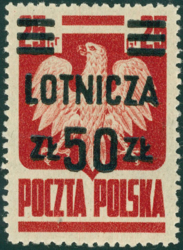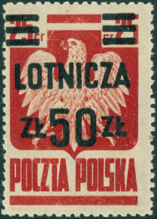 1947 przedrukowe wydanie lotnicze, znaczek za 50 zł./25 gr. w kolorze brązowoczerwonym z dwoma niekatalogowanymi błędami na poz.5 "dziura w lewej środkowej belce" i "wcięcie w cyfrze 0", gwarancja z opisem odmiany, pozycji i błędów Walocha. | Fi.442b B Mi.477b |
