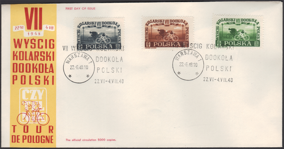 1948 FDC - "VII Wyścig kolarski dookoła Polski", nakład 5000 sztuk, bardzo dobry stan zachowania (Mi.25 euro). | Fi.456-58 Mi.487-89 |