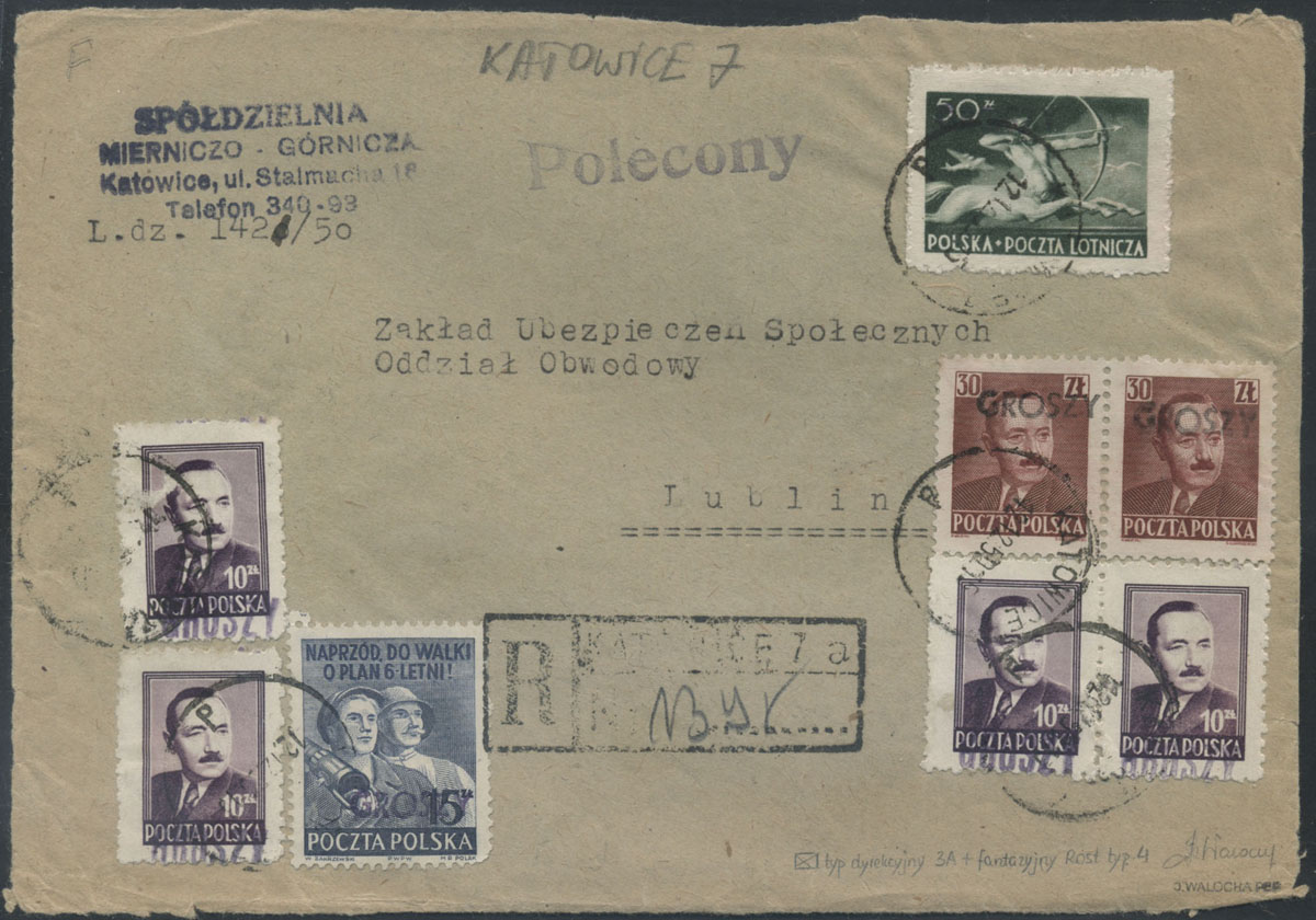 1950 groszy, front listu poleconego z Katowic do Lublina opłacony znaczkami z nadrukiem dyrekcyjnym typu 3A i fantazyjnym według Rosta typu 4, gwarancja i opis Walocha. | Fi.447, 474, 524, 527 |