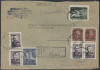 1950 "groszy" znaczki z nadrukiem typu 3, dekoracyjnie ofrankowany list polecony w tym znaczkami nieodnotowanymi z przedrukiem: Kultura Polska II za 20 zł nieząbkowany czworoblok legitymacyjny z oznaczeniem walca N.2.W.VIII i 5 zł ząbkowane, Kultura Polska I za 3 zł i 6 zł ząbkowane, wysłany 10.1.51 z Tarnowa do miejscowości Tuchów, datownik odbiorczy z 11.1 na odwrocie; efektowny walor w bardzo dobrym stanie zachowania (same znaczki kasowane Mi.97 euro). | Fi.436A, 422B, 424B, 432B, 471, 525 Mi.579B, 567A, 569A, 575A, 622, 657 |