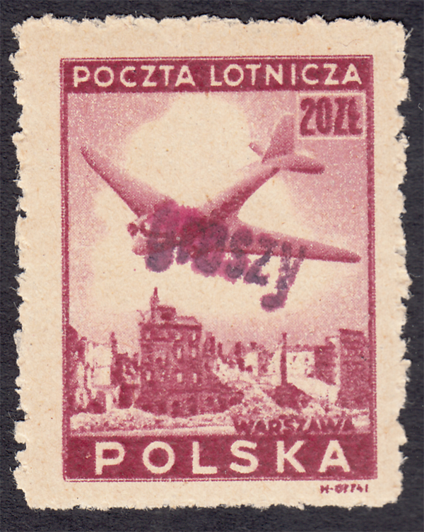 1950 "groszy - lokalny", Bielsko 2, wydanie lotnicze, nienotowany dotąd znaczek lotniczy za 20 zł. z lila stempelkiem typu 38, gwarancja i opis Krawczyk. | Fi.398 Mi.565 |
