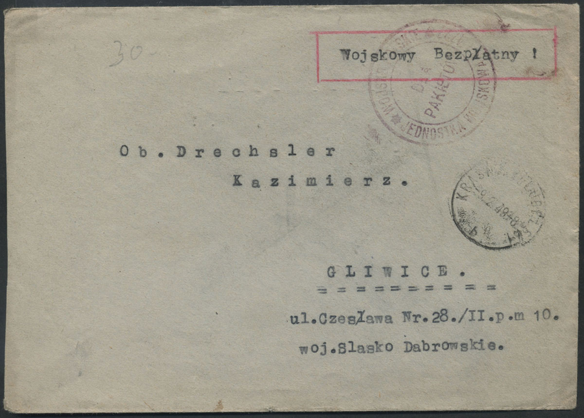 1949 list z jednostki wojskowej zwolniony z opłaty pocztowej do Gliwic. | |