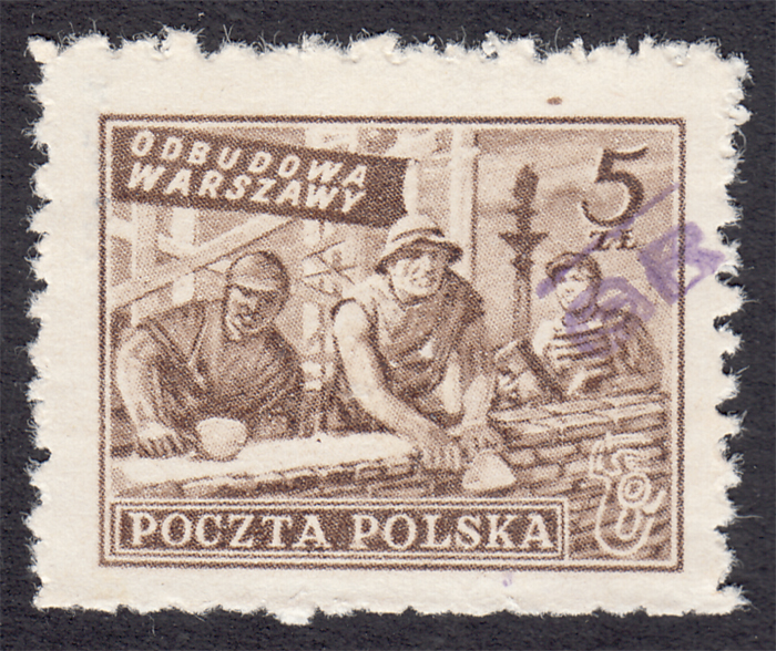 1950 "groszy - lokalny", Bielsk Podlaski, odbudowa Warszawy, znaczek za 5 zł. z fioletowym stempelkiem typu 37, pochodzi z historycznej kolekcji St.Ćwiertni i ma na odwrocie jego gwarancję. | Fi.513 Mi.659 |