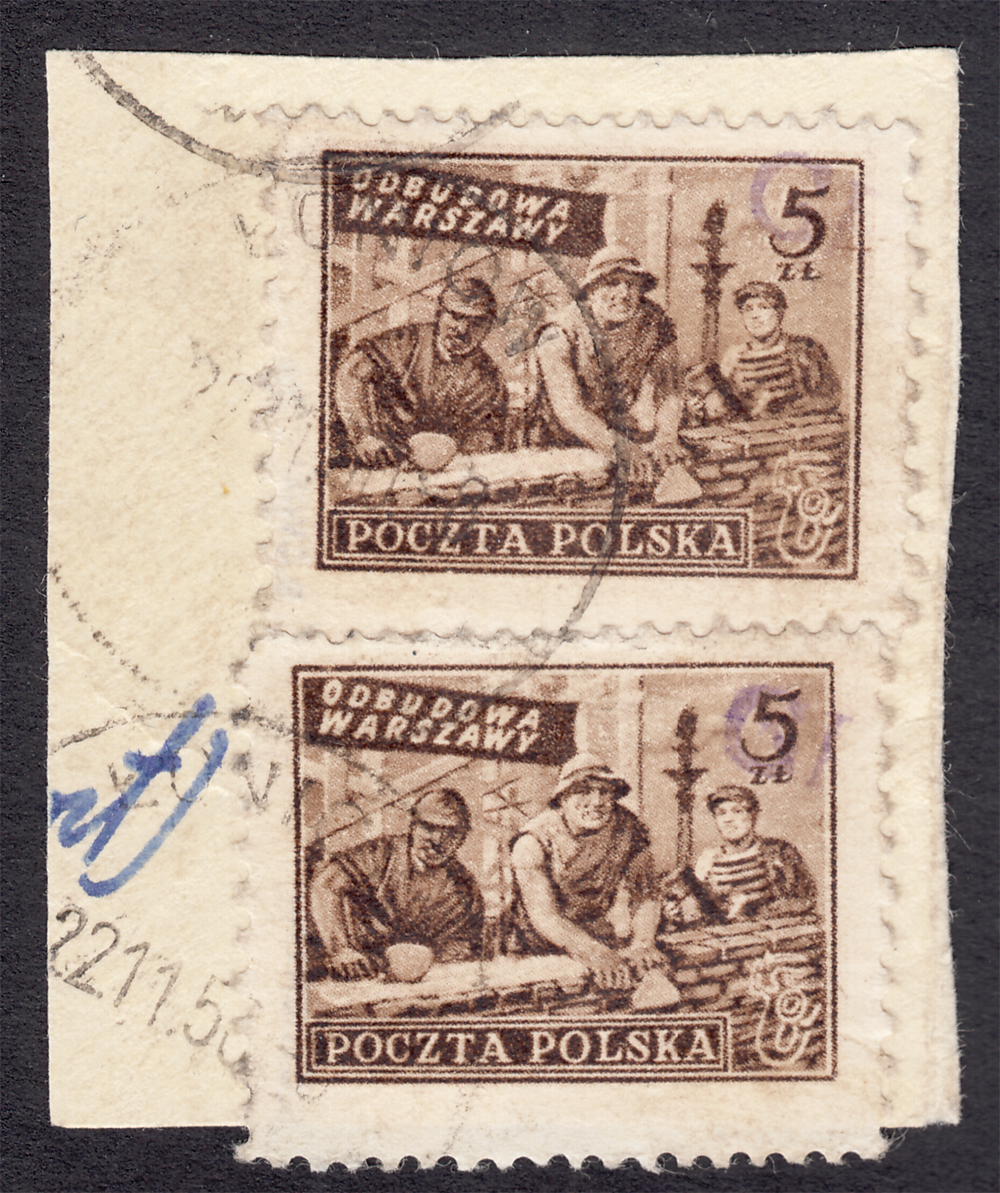 1950 "groszy - lokalny", Łoniów, Odbudowa Warszawy, parka nienotowanych dotąd znaczków za 5 zł. z fioletowym stempelkiem bardzo rzadkiego typu 48 na wycinku z listu użytkowego, bardzo czytelny datownik ŁONIÓW z dnia 22.11.50 odbity na obu znaczkach, wycinek pochodzi z historycznej kolekcji St.Ćwiertni, posiada jego opis na odwrocie wycinka i gwarancję Ćwiertnia bezpośrednio na obu znaczkach, na oryginalnej korespondencji unikalny. | Fi.513 Mi.659 |