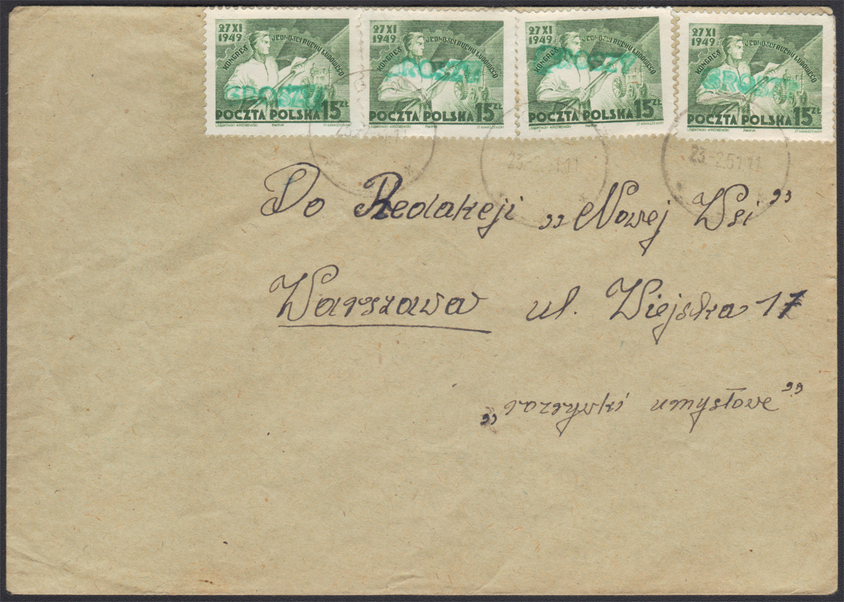 1950 groszy, list z Miechowa do Wrocławia opłacony znaczkami z nadrukiem groszy typ 3 w kolorze fioletowym. | Fi.503 Mi.644 |