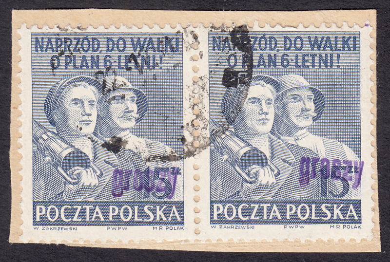 1950 "groszy - lokalny", Bielsko 2, Plan 6-letni, parka znaczków za 15 zł. - typ II, z fioletowym stempelkiem typu 37 na wycinku, pochodzi z historycznej kolekcji St.Ćwiertni i ma na odwrocie jego gwarancję. | Fi.527II Mi.562b |