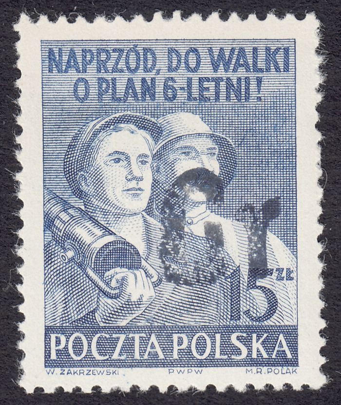 1950 "groszy - lokalny", Brzeg Dolny, Plan 6-letni, znaczek za 15 zł. - typ I, z czarnym stempelkiem bardzo rzadkiego typu 45 (Fi.200.-), gwarancja i opis Krawczyk. | Fi.527I Mi.665 |