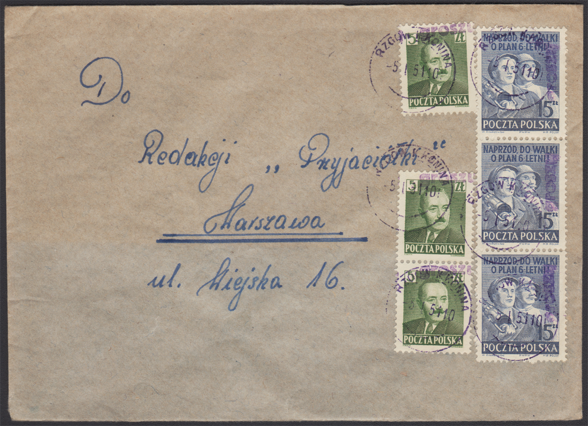 1950 "groszy" znaczki z nadrukiem typu 13, jednym z czterech najrzadszych typów dyrekcyjnych, list wysłany 5.I.1951 z miejscowości Rzgów k. Konina do Warszawy; rzadki walor w bardzo dobrym stanie zachowania (Mi.120 euro - znaczek z nadrukiem typu 13 na liście); pochodzi z historycznej kolekcji A.Roszkowskiego i ma jego gwarancję. | Fi.527II, 533 Mi.650, 665 |