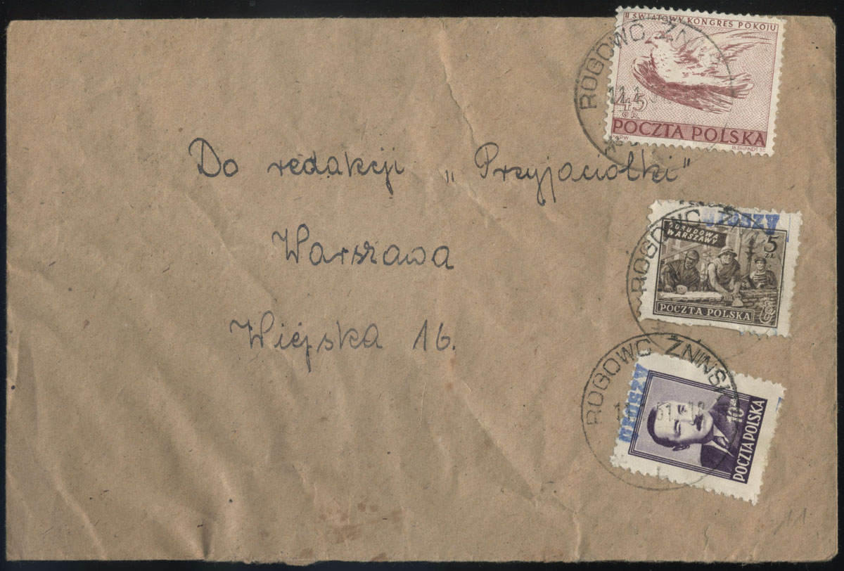 1951 groszy, list z Rogowa Żnińskiego do Warszawy opłacony znaczkami z nadrukiem groszy typ 11 w barwie niebieskiej. | Fi.474, 513, 531 |