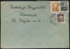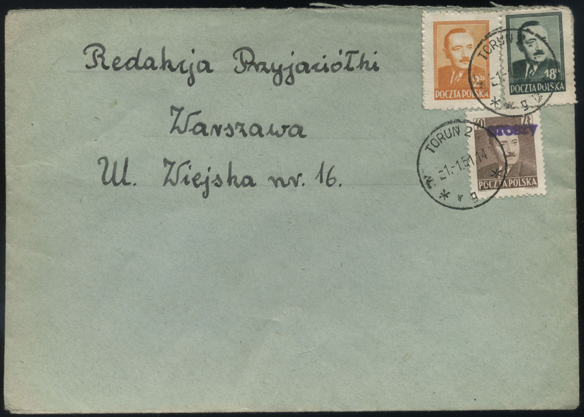 1951 groszy, list z Torunia do Warszawy opłacony znaczkiem z nadrukiem groszy typ 2 w barwie fioletowej, dwa znaczki bez nadruku. | Fi.470, 476, 525 |