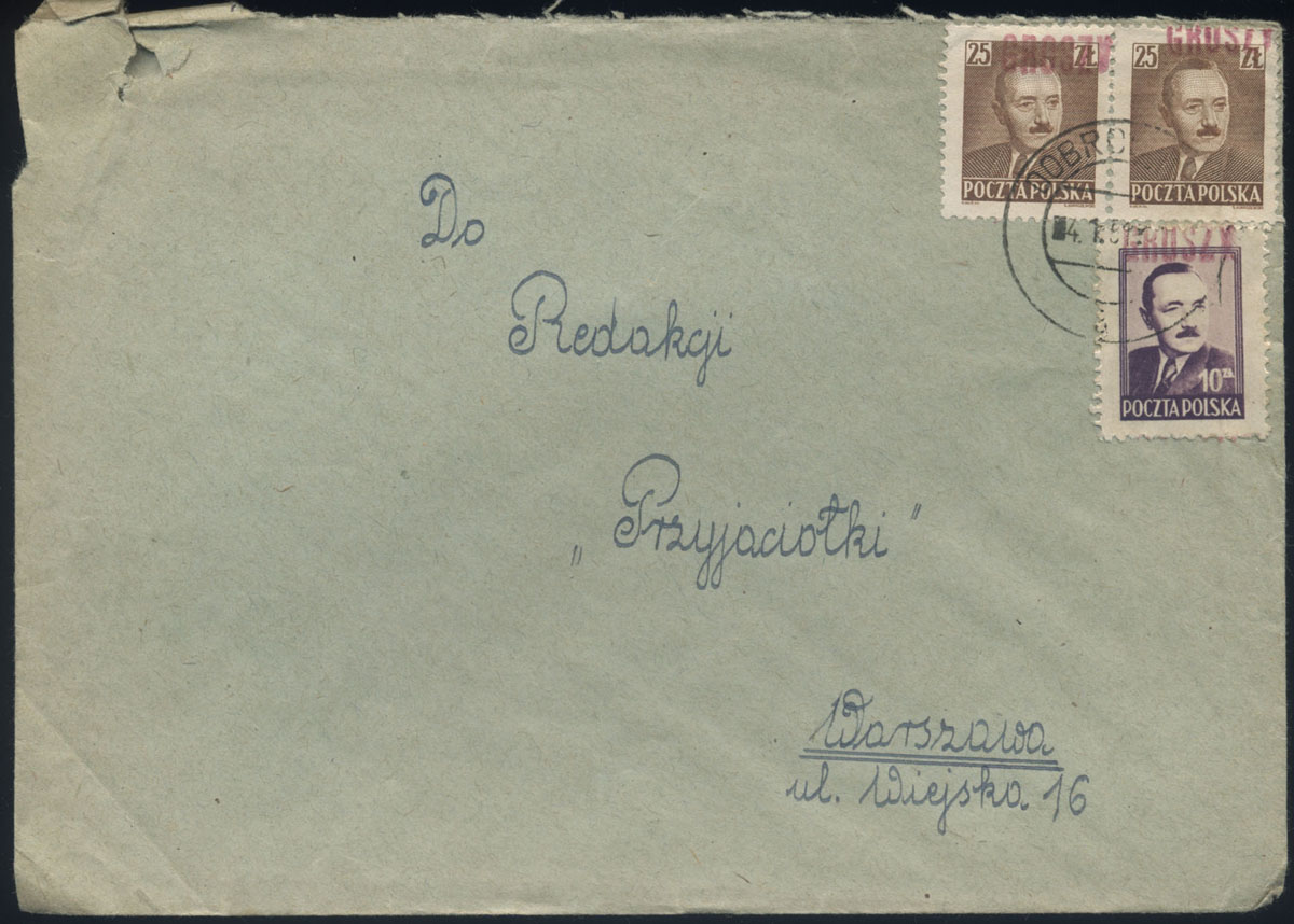 1951 groszy, list z Albigowej do Warszawy opłacony znaczkami z nadrukiem groszy typ 3B w barwie czarnej. | Fi.447, 520 Mi.588, 651 |
