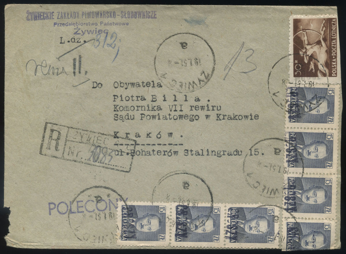 1951 groszy, fragment dużego listu poleconego z Krakowa do Wrocławia opłacony znaczkami z nadrukiem groszy typ 3 w kolorze fioletowym. | Fi.448, 535 Mi.589, 673 |