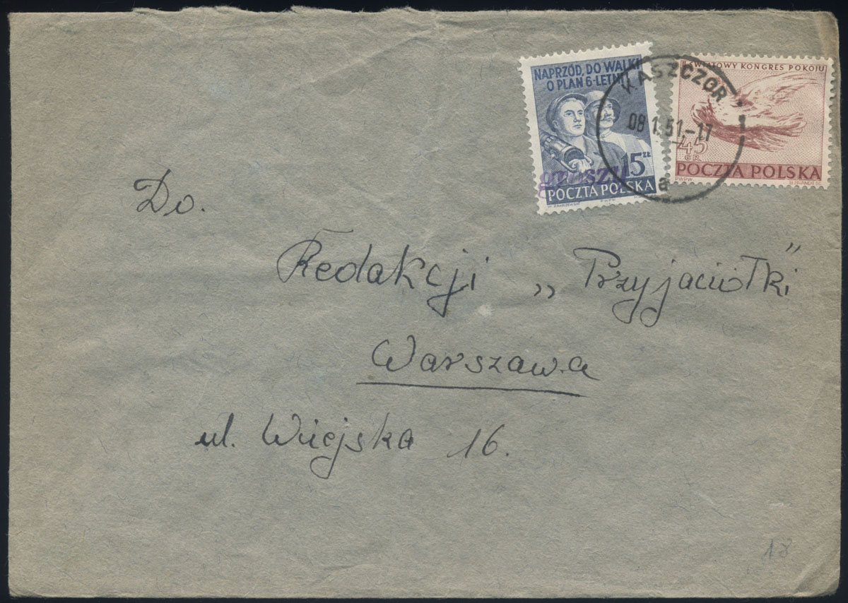 1951 groszy, list z Kaszczor do Warszawy opłacony znaczkiem z nadrukiem groszy typ 18 w barwie fioletowej. | Fi.527, 531 |