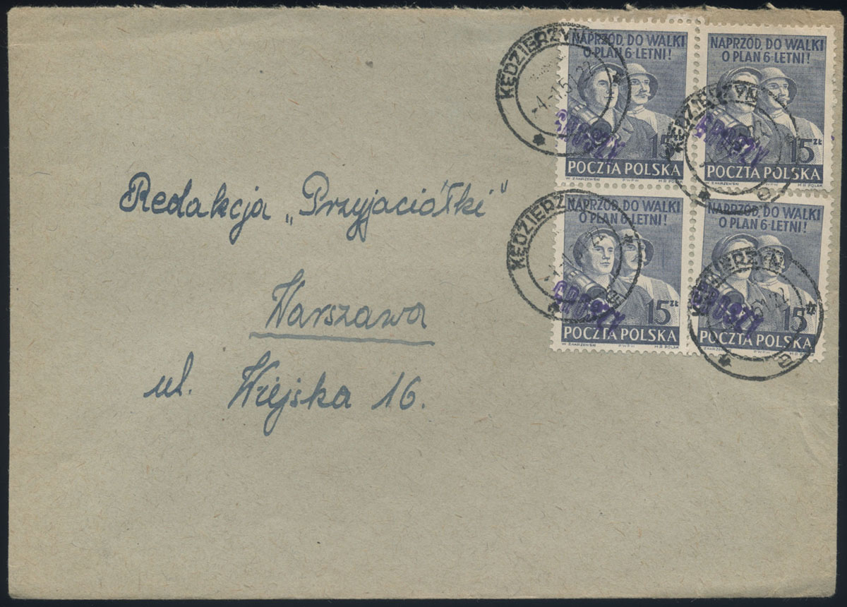 1951 groszy, list z Kędzierzyna do Warszawy opłacony znaczkami z nadrukiem groszy typ 3 w barwie fioletowej. | Fi.527 |