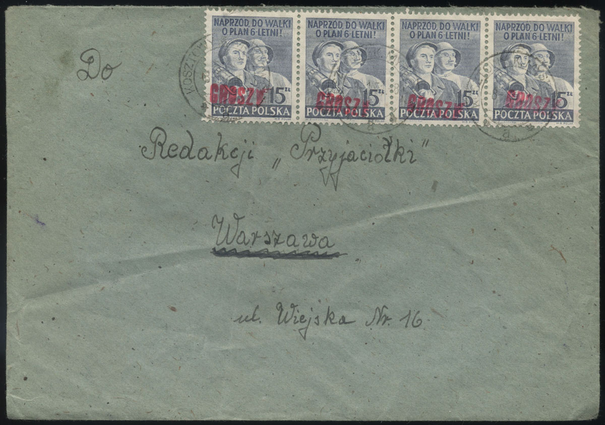 1951 groszy, list z Kosztowy koło Mysłowic do Warszawy opłacony znaczkami z nadrukiem groszy typ 3 w barwie czerwonej. | Fi.527 |