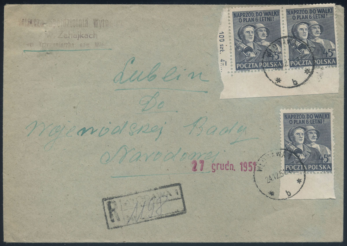 1951 plan sześcioletni, list polecony z Włodawy do Lublina, parka narożnych znaczków z numerem walca na lewym marginesie. | Fi.542 |