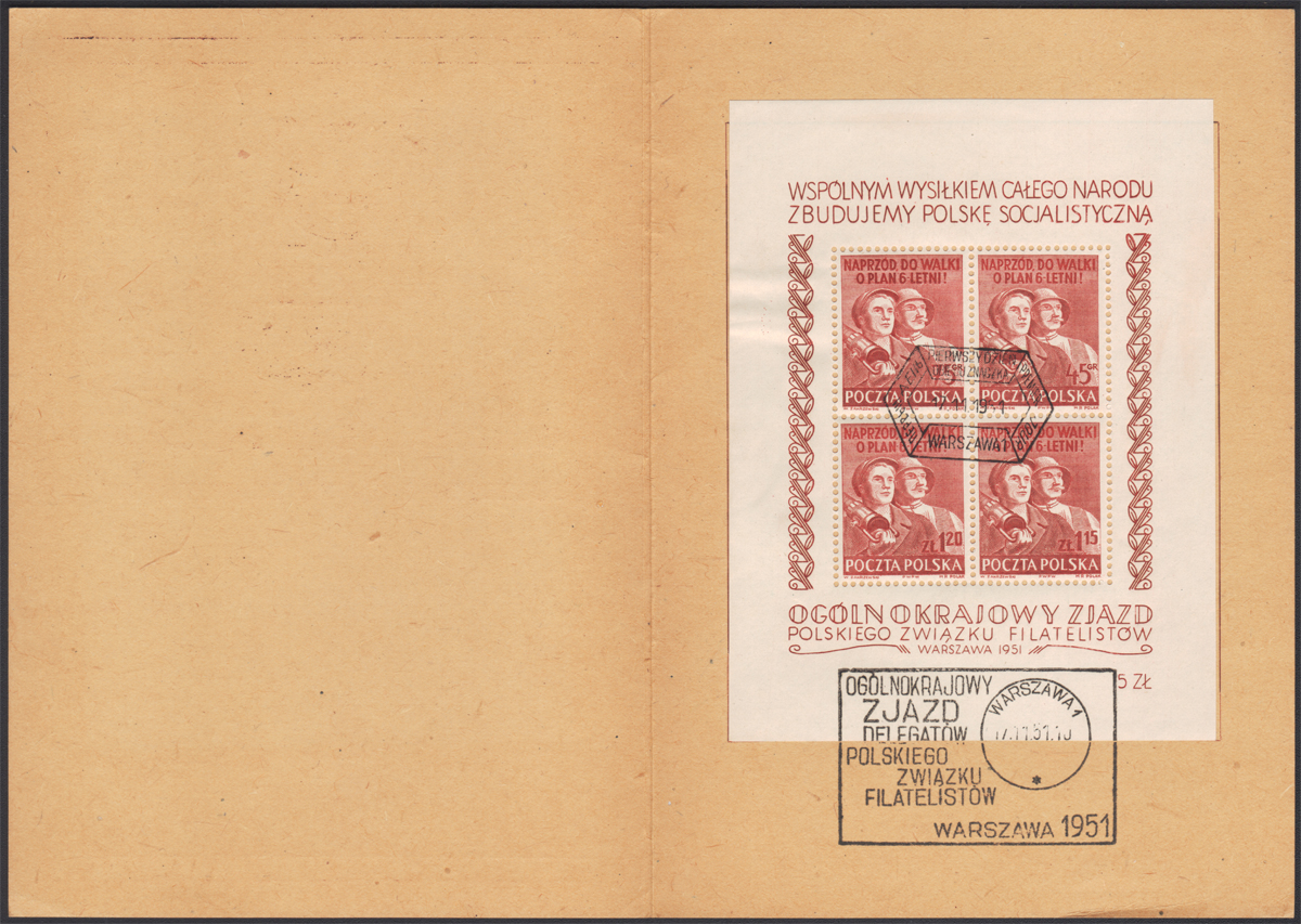 1951 karnet, FDC - blok "I OGÓLNOPOLSKI ZJAZD DELEGATÓW PZF" blok skasowany sześciokątnym stemplem "PIERWSZY DZIEŃ OBIEGU". | Fi.bl.12 |