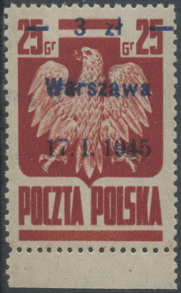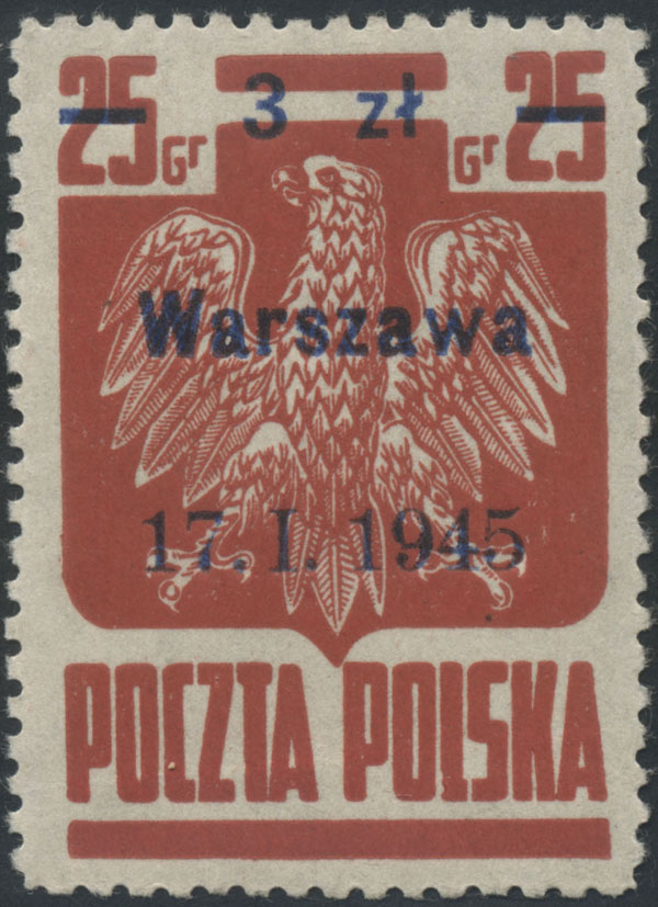 1945 "Warszawa" - wyzwolenie dziesięciu miast, znaczek za 3 zł./25 gr. w kolorze brązowoczerwonym z lekko obróconym i mocno przesuniętym w dół nadrukiem, gwarancja. | Fi.348b Mi.390IXb |