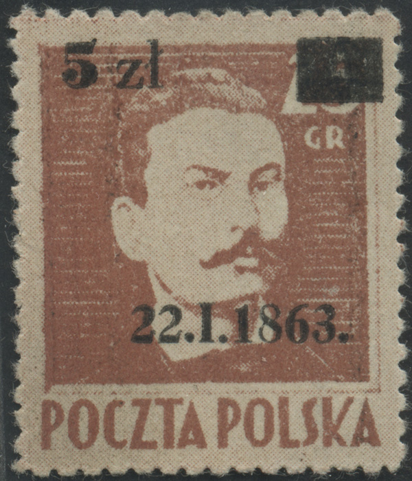 1945 Powstanie Styczniowe - R.Traugutt, znaczek za 5 zł./25 gr. w rzadkim kolorze jasno różowobrązowym, z dobrze wykształconym błędem nadruku występującego na poz.1 w części nakładu "rozdzielony prostokąt", gwarancja z opisem koloru i oznaczeniem błędu. | Fi.347ea B1 Mi.389 |