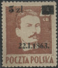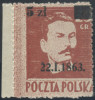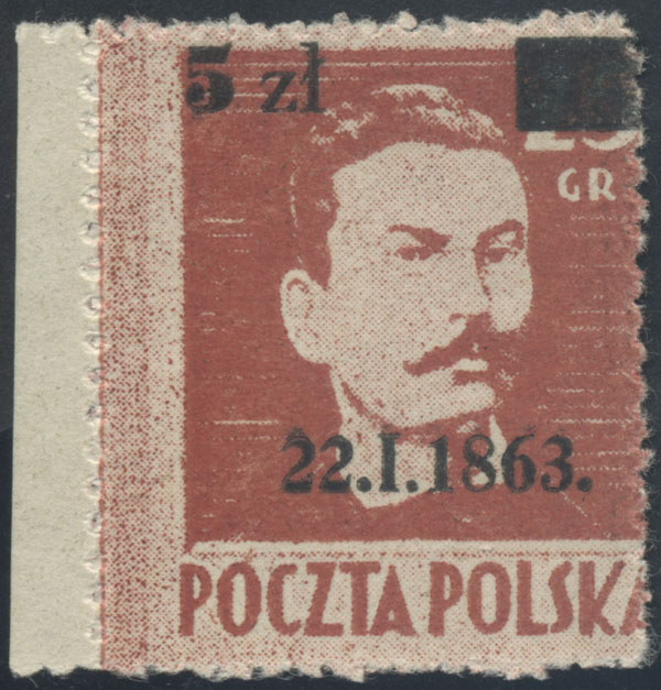 1945 82. rocznica Powstania Styczniowego, znaczek za 5 zł./25 gr. w rzadszym kolorze brązoworóżowym z błędami na poz.23: na znaczku podstawowym "PÓLSKA" i nadruku "wcięcie w drugiej dwójce daty", gwarancja i opis Walocha. | Fi.347eb B13+14 Mi.389 |