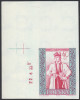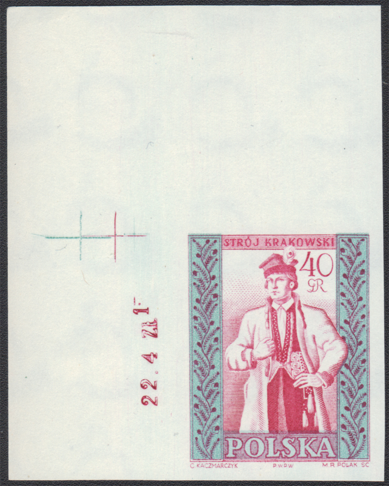 1960 Polskie stroje ludowe (II), metrykalny znaczek nieząbkowany za 40 gr z poz. 1 z oznaczeniami: walca (1 walec, 1 nakład, 1 moletowanie) oraz znakami markacyjnymi - krzyżykami dla walców: stalorytniczego - lilioworóżowym, rotograwiurowego - niebieskim, widać lekko niedokładne spasowanie tła i rysunku - poziome ramiona krzyżyków "nie schodzą się"; na lewym marginesie liczba rozrachunkowa; bardzo dobry stan zachowania. | Fi.1012A Mi.1156B |