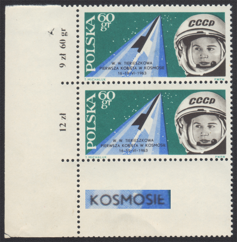 1963 Drugi zespołowy lot kosmiczny, narożnikowa parka znaczków za 60 gr., dolny z błędem na poz.17 "E jak Ł w KOSMOSIŁ" i co rzadkie z pustopolem, gwarancja Walocha. | Fi.1268 Pp B2 Mi.1416 |