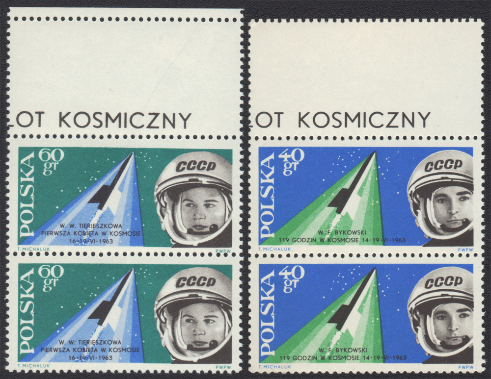 1963 Drugi zespołowy lot kosmiczny, parki znaczków za 40 i 60 gr. z pustopolami na górze, na pustopolu napis LOT KOSMICZNY. | Fi.1267-68 Pp Mi.1415-16 |