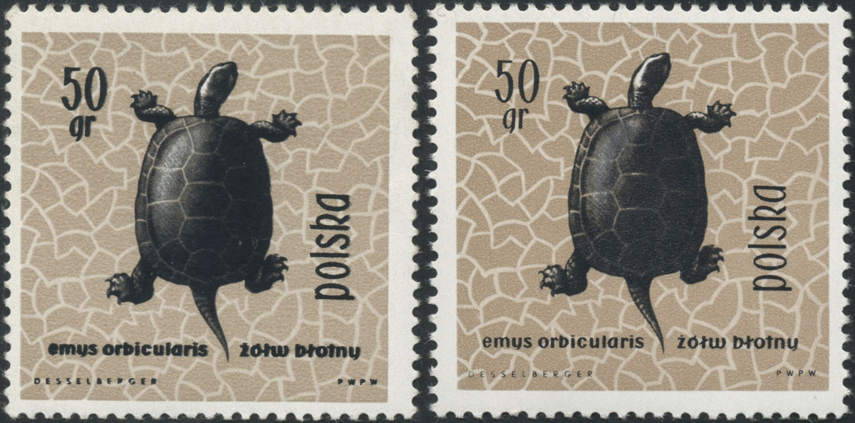 1963 gady i płazy znaczek z drukiem zdowojonym z "rozlania" czarnej farby, dla porównania po prawej prawidłowo wydrukowany znaczek, gwarancja i opis Walocha. | Fi.1247MK Mi.1395 |