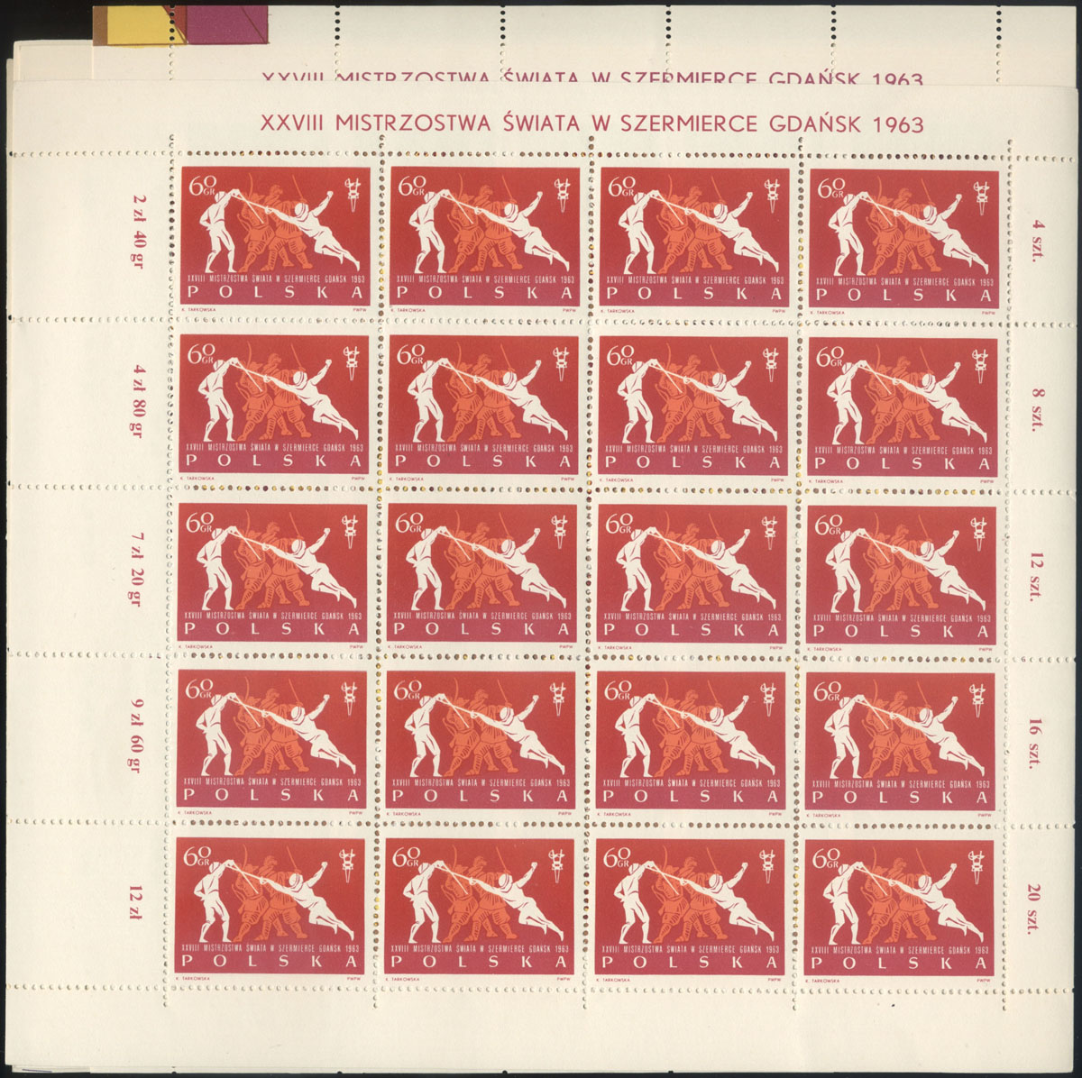 1963 XXVIII mistrzostwa świata w szermierce w Gdańsku, seria w arkuszach sprzedażnych. | Fi.1257-62 ark. Mi.1405-10 |