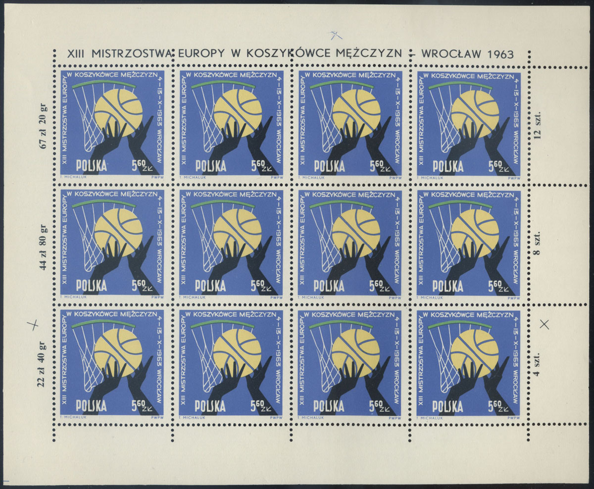 1963 Mistrzostwa Europy w koszykówce, seria w arkuszach sprzedażnych. | Fi.1270-5 ark. Mi.1963 Mistrzostwa Europy w koszykówce, seria w stemplowanych arkuszach sprzeda |