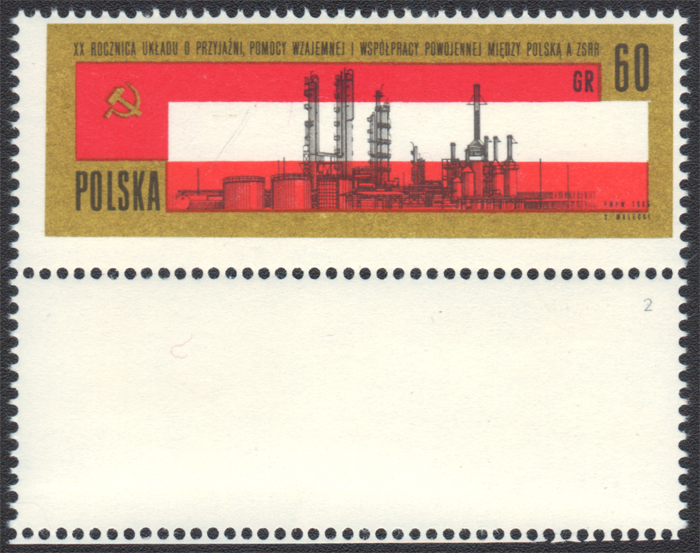 1965 20. rocznica układu PRL - ZSRR, znaczek czysty za 60 gr., bardzo rzadki z pustopolem pod znaczkiem i fartuchem na marginesie, jak zwykle w tym wydaniu gumowanie nie pokrywa dolnej części marginesu. | Fi.1432 Pp Mi.1581 |