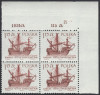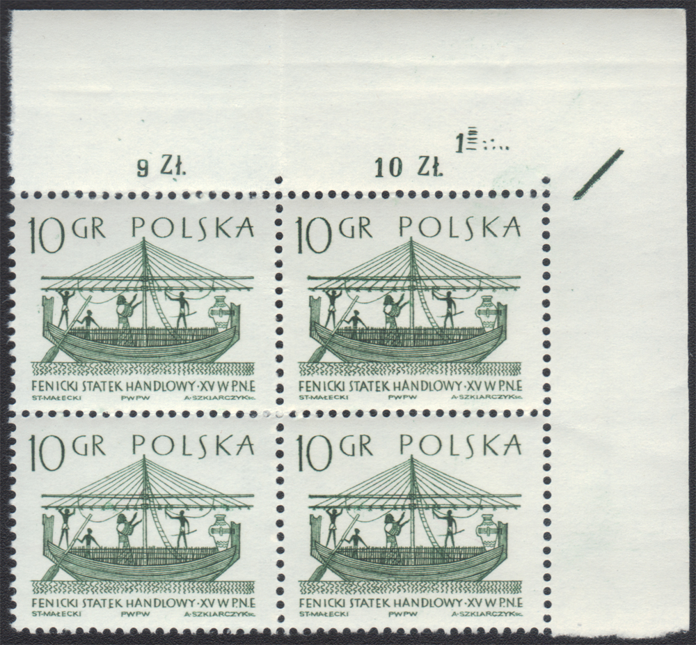 1965 Statki żaglowe (III), 10 gr metrykalny czworoblok znaczków z poz. 9/20 z oznaczeniami walca (1 walec, 6 nakład, 6 moletowanie), autotronu - ukośnej kreski służącej do sterowania automatyczną synchronizacją urządzenia perforującego oraz liczb rozrachunkowych na górnym marginesie; bardzo dobry stan zachowania. | Fi.1414 Mi.1563 |