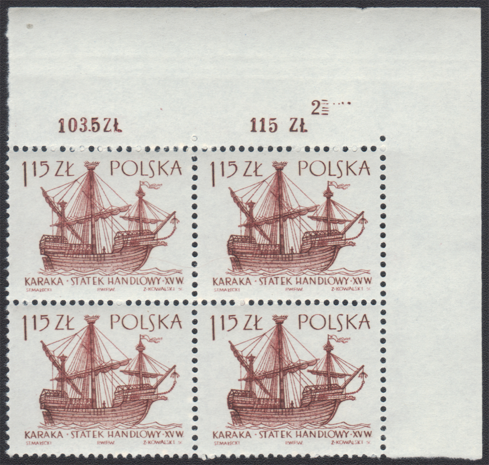 1965 Statki żaglowe (III), 1,15 zł metrykalny czworoblok znaczków z poz. 9/20 z oznaczeniami walca (2 walec, 5 nakład, 4 moletowanie) oraz liczb rozrachunkowych na górnym marginesie; bardzo dobry stan zachowania. | Fi.1420 Mi.1569 |