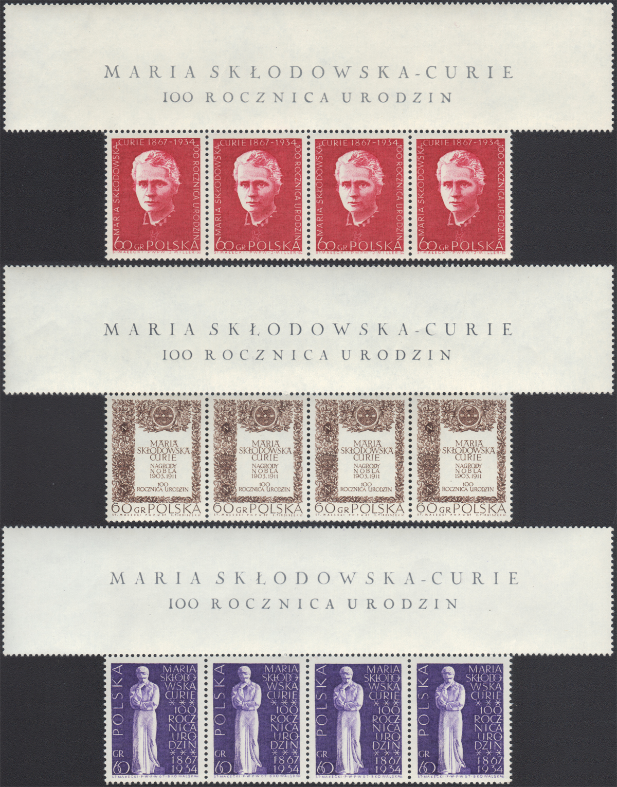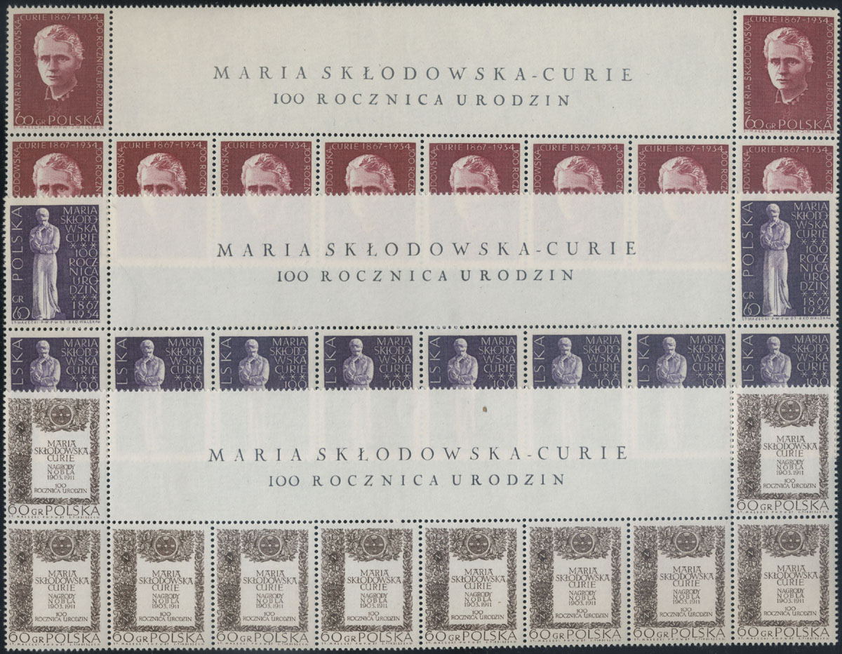 1967 100. rocznica urodzin Marii Skłodowskiej-Curie, seria w parkach rozdzielonych przywieszką, dodatkowo jeden rząd znaczków. | Fi.1630-2 Mi.1777-9 |