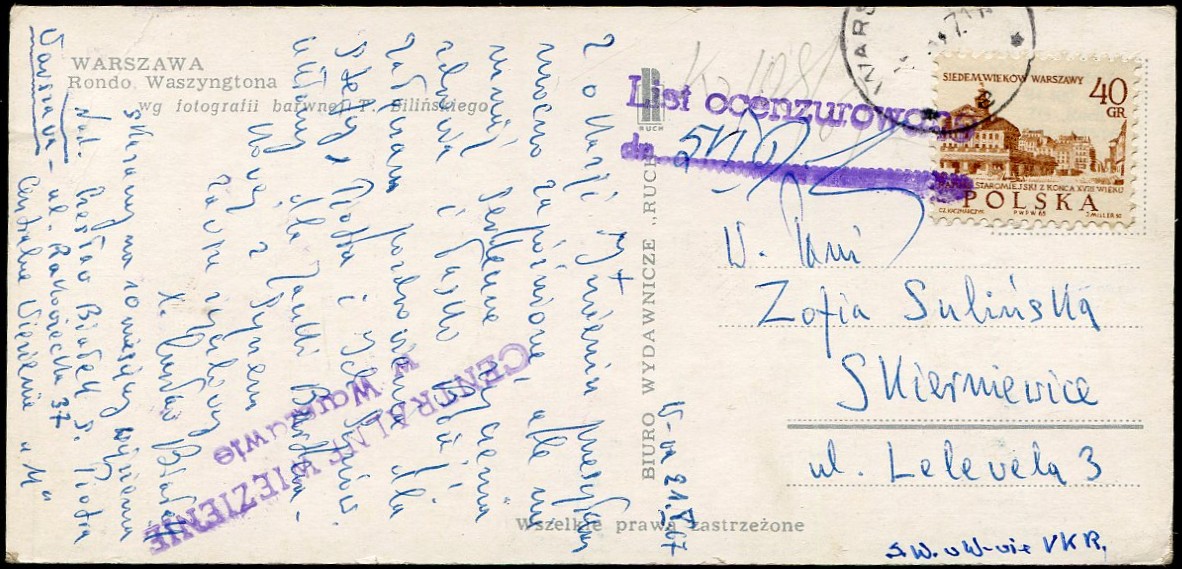 1967 kartka wysłana z Centralnego Więzienia w Warszawie przy ul. Rakowieckiej, stempel "List ocenzurowano". | |