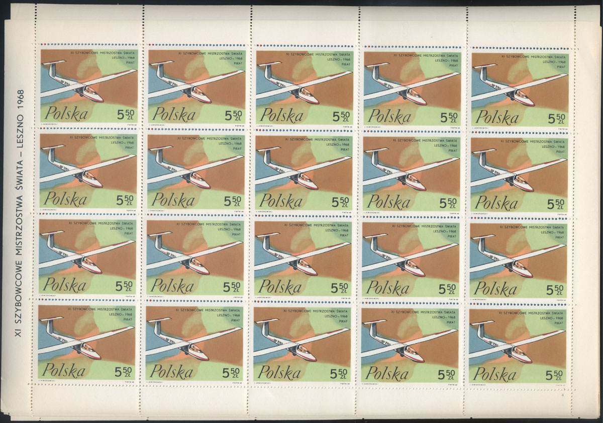 1968 XI Szybowcowe Mistrzostwa Świata w Lesznie, seria w arkuszach sprzedażnych. | Fi.1699-704 ark. Mi.1846-51 |