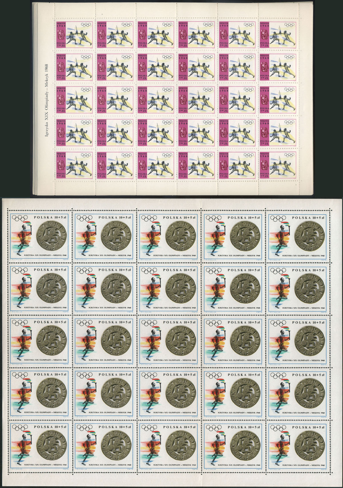 1968 Igrzyska Olimpijskie w Meksyku, seria w arkuszach sprzedażnych, arkusz znaczka za 10+5 zł zagięty w połowie. | Fi.1708-16 ark. Mi.1855-63 |