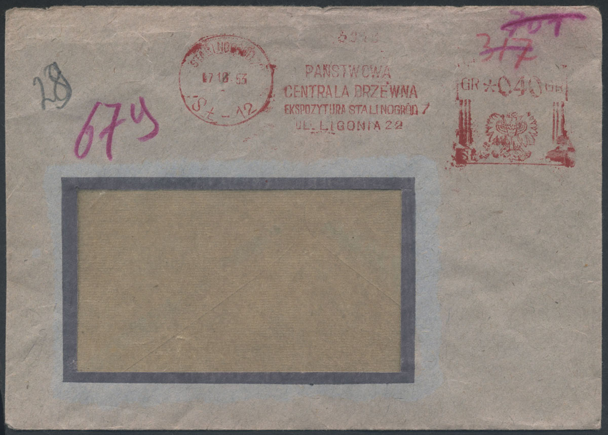 1953 list firmowy ze Stalinogrodu opłacony frankaturą mechaniczną. | |