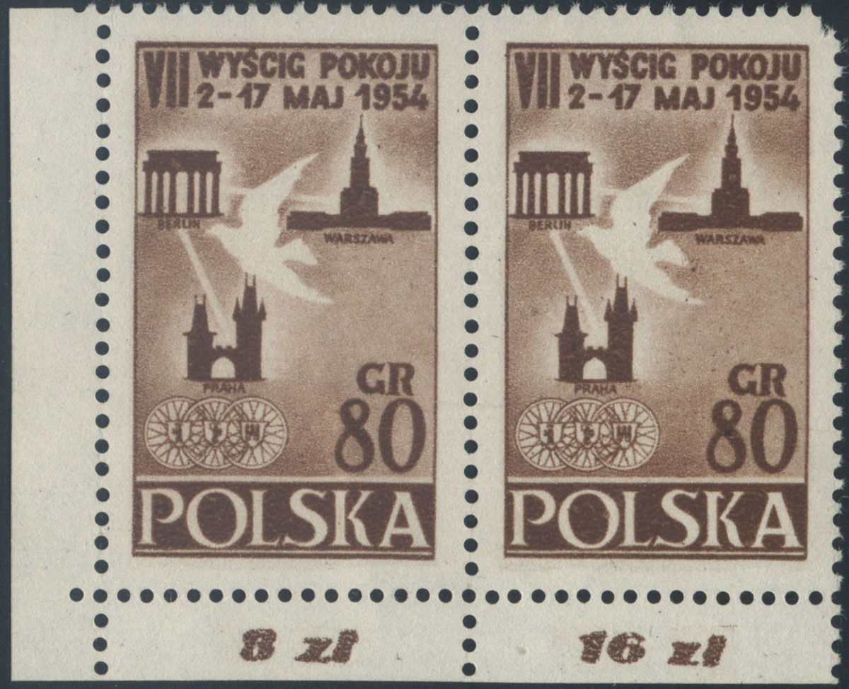 1954 VII Wyścig Pokoju, narożny znaczek z błędem "kropka na prawo od wieży". | Fi.707B4 Mi.845 |