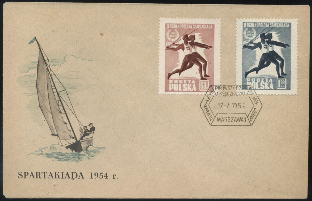 1954 II Ogólnopolska Spartakiada, koperta pierwszego dnia obiegu. | Fi.721-2 FDC Mi.864-5 |