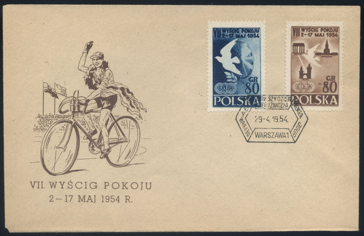 1954 VII Wyścig Pokoju, koperta pierwszego dnia obiegu. | Fi.707-8 FDC Mi.845-6 |