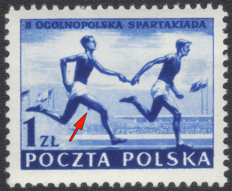 1954 II Ogólnopolska Spartakiada (II), znaczek za 1zł z powtarzalnym błędem "wypustka pod udem drugiego zawodnika"; bardzo dobry stan zachowania; gwarancja i opis Walocha. | Fi.725 B Mi.853 |