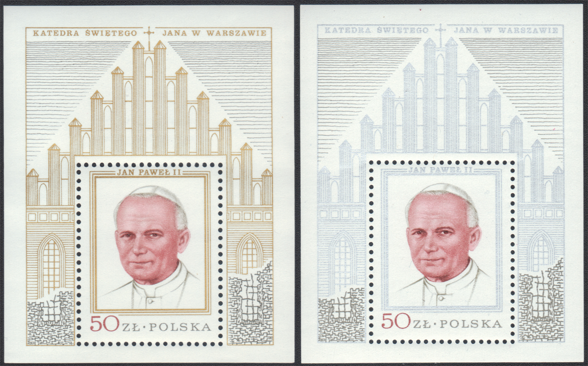1979 I wizyta papieża Jana Pawła II w Polsce, komplet bloków - "złotego" i "srebrnego", który nie był dostępny w abonamencie (Fi.58.-); bardzo dobry stan zachowania. | Fi.bl.106 a-b Mi.Bl.75-76 |