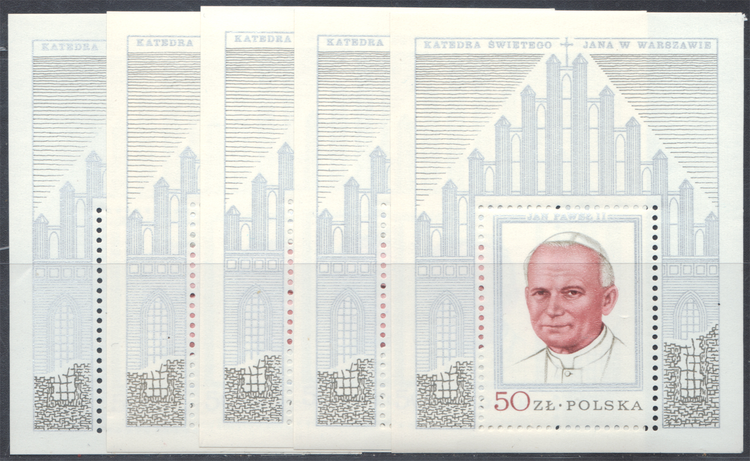 1979 I wizyta papieża Jana Pawła II w Polsce, zestaw 5 bloków "srebrnych" niedostępnych w abonamencie (Fi.250.-); bardzo dobry stan zachowania. | Fi.bl.106b Mi.Bl.76 |