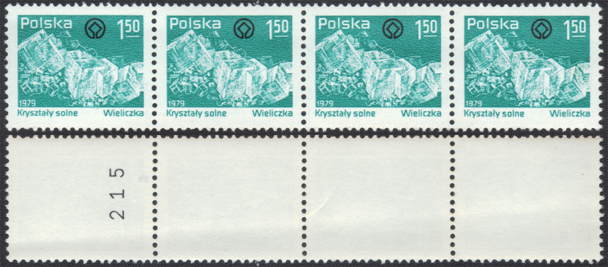 1979 Kopalnia soli w Wieliczce, znaczki za 1,50 zł drukowane z rolki, pasek czterech sztuk w tym jeden z numerem na odwrocie tak jak pokazano na reprodukcji powyżej; najrzadsze z polskich powojennych znaczków do automatów; dobry stan zachowania (znaczki nadgięte - nie złamane). | Fi.2491 Mi.2639 |