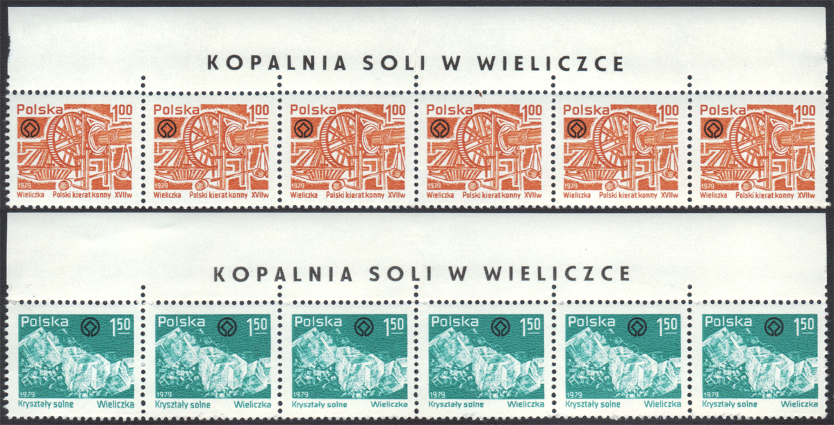 1979 Kopalnia soli w Wieliczce, seria w paskach 6 znaczków z górnym marginesem z nazwą emisji; bardzo dobry stan zachowania (pasek znaczków za 1 zł zgięty w połowie na ząbkach). | Fi.2490-91 Mi.2638-39 |