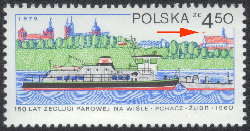 1979 150-lecie żeglugi parowej na Wiśle, znaczek za 4,50 zł z błędem na poz.3 w 3 sektorze "latawiec nad dachem"; bardzo dobry stan zachowania; gwarancja i opis. | Fi.2487 B1 Mi.2635 |