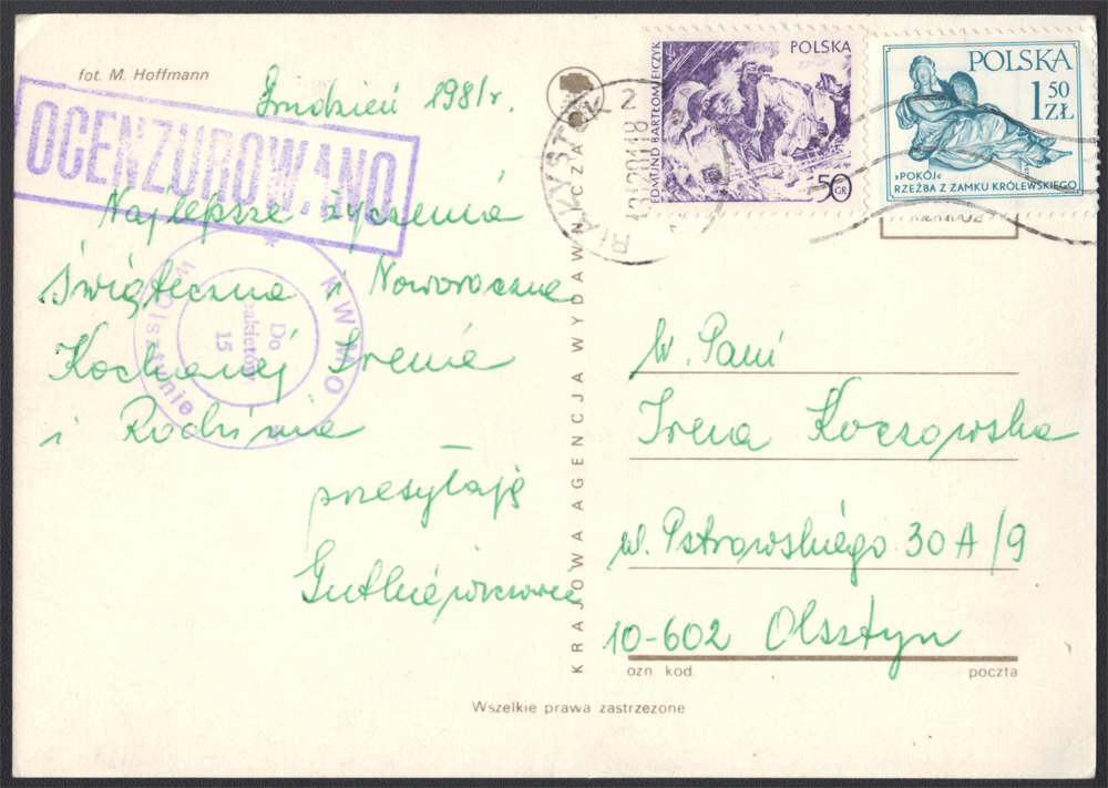 1982 STAN WOJENNY - karta pocztowa nadana 13.12 w dniu wprowadzenia w Polsce Stanu Wojennego w urzędzie Białystok 2 do Olsztyna, stemple: ramkowy "OCENZUROWANO" i rzadki stosowany przed wprowadzeniem stempli cenzury - dwuobrączkowy "KWMO w Olsztynie Do pakietów 15", bardzo dobry stan zachowania. | Fi.2460, 2478 Mi.2697, 2624 |